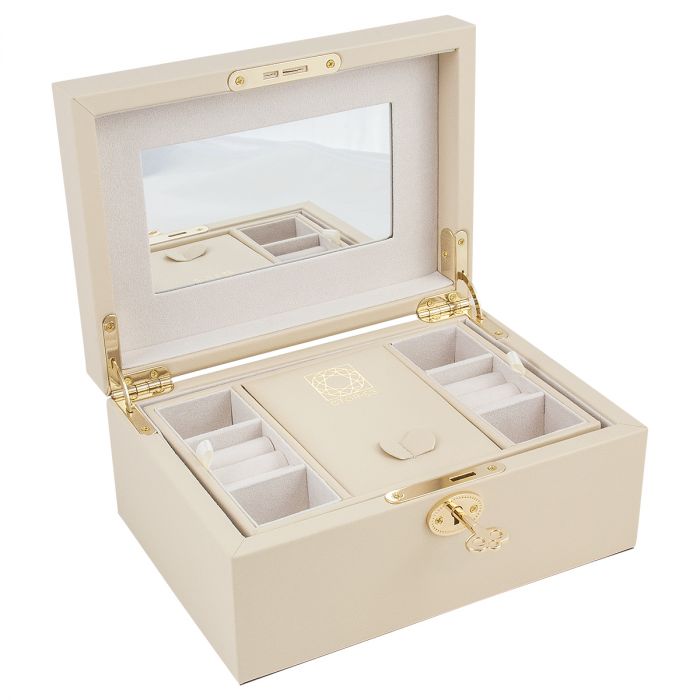 Smykkeskrin i beige kunstlæder med nøglelås