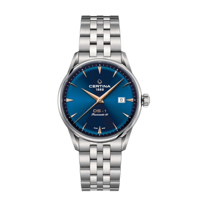 Certina DS-1 Powermatic 80, blå skive med stål lænke og ekstra nylonrem