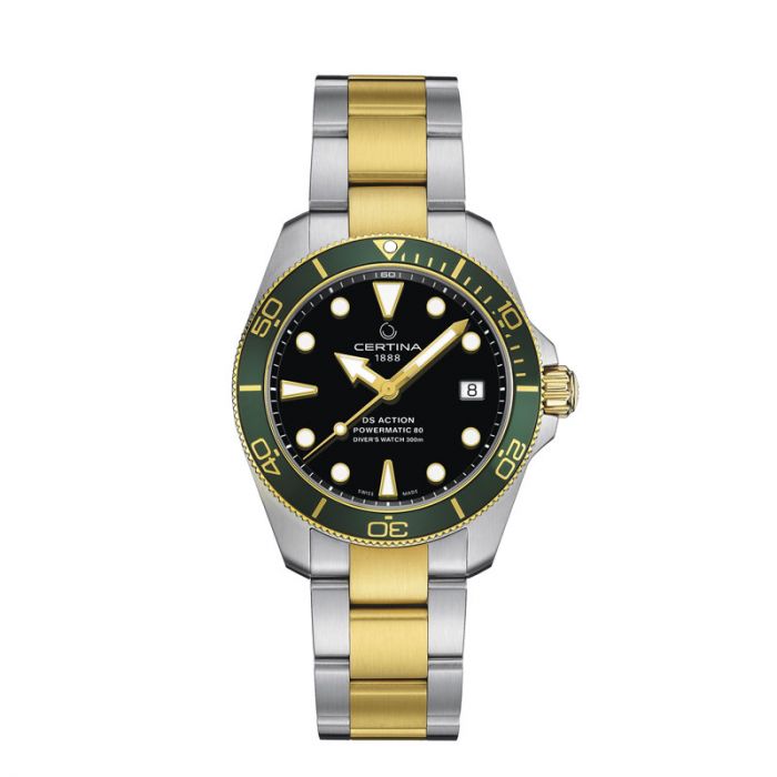 Certina DS Action Powermatic 80 i bicolour med sort skive og grøn krans Ø38