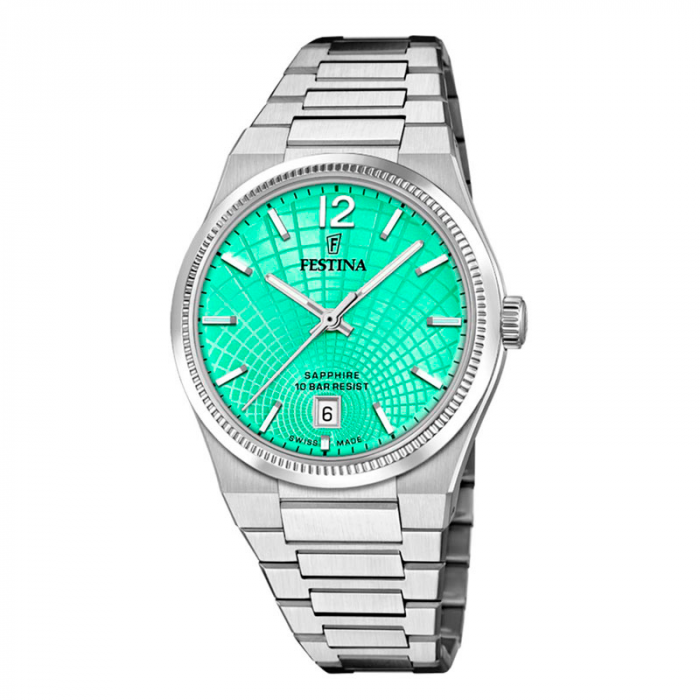 Festina Swiss Made Rivé dameur i stål med turkis-grøn urskive