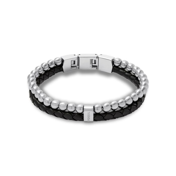 Fossil Beads armbånd med stålkugler og flettet læder