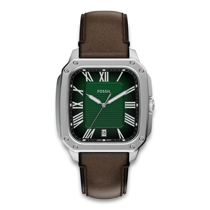 Fossil Crosby i stål med brun læderrem, grøn skive