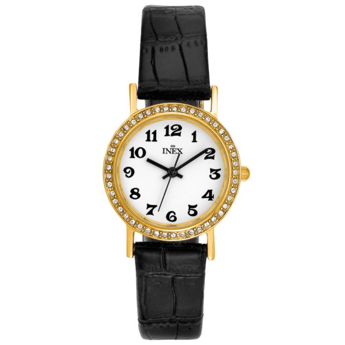 INEX dameur - double med sort rem, hvid skive med krystaller Ø 25