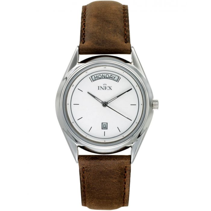 INEX dameur - stål med brun rem, dato og ugedag, hvid skive Ø 38
