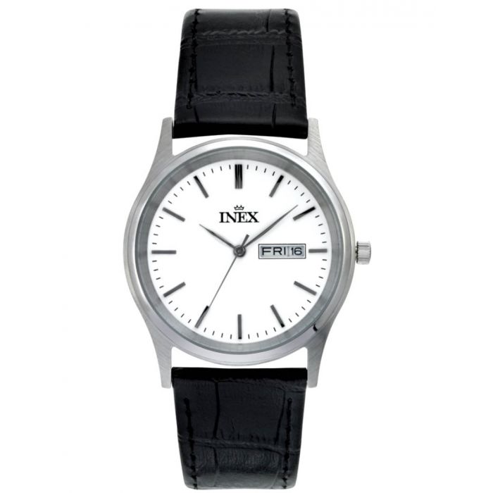 INEX herreur i stål med sort rem, hvid skive og dato+ugedag