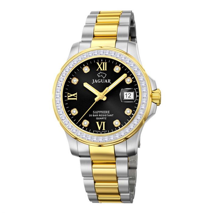 Jaguar Lady Diver dameur i bicolour stål, sort urskive med cubic zirkoner