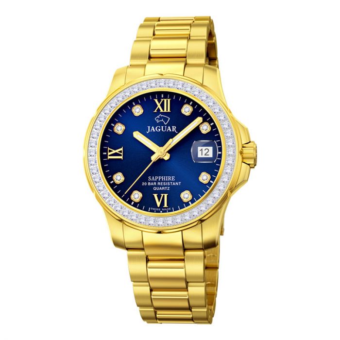 Jaguar Lady Diver guldfarvet dameur, blå urskive med cubic zirkoner