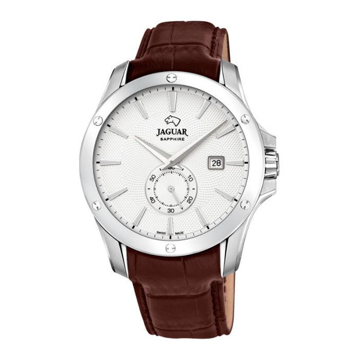 JAGUAR armbåndsur i stål med hvid skive og brun læderrem