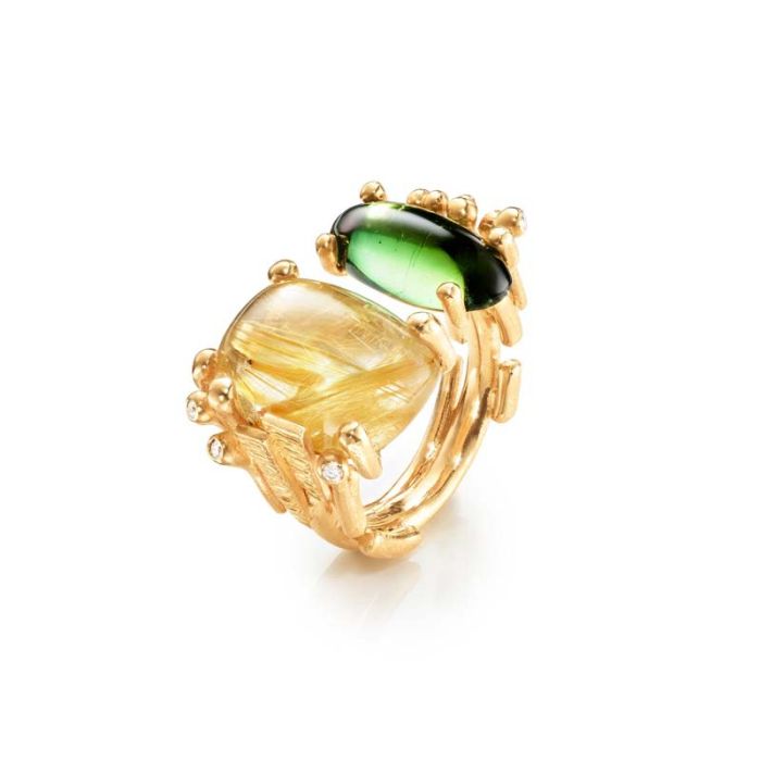 OLE LYNGGAARD COPENHAGEN BoHo 18 kt. guld ring med rutil og grøn turmalin og 6 brillanter
