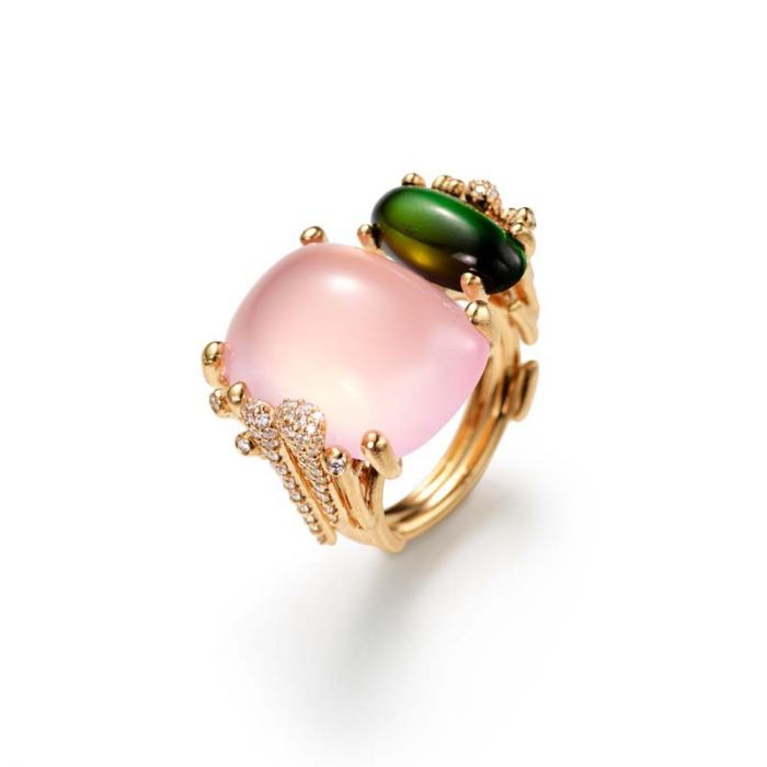 OLE LYNGGAARD COPENHAGEN BoHo Ring i 18 karat guld med grøn turmalin, rosaquartz og 70 diamanter