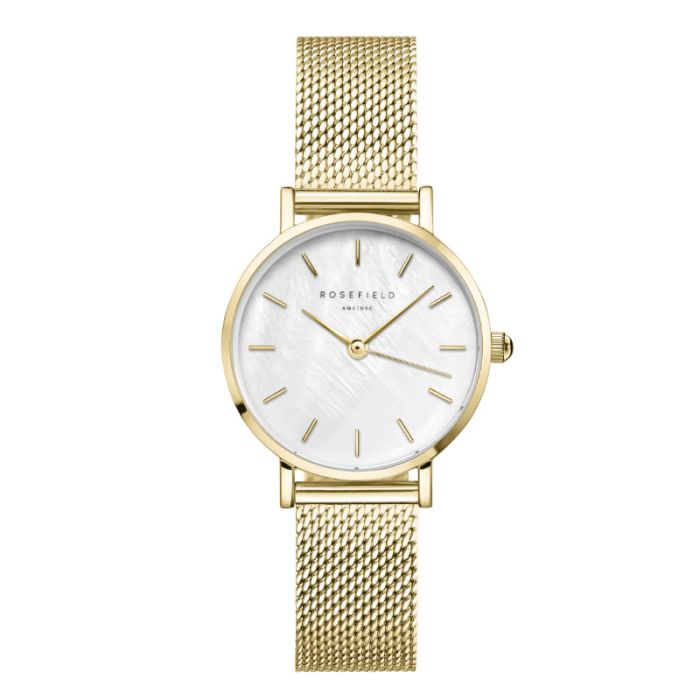 Rosefield The Small Edit dameur i guldfarvet med meshlænke og perlemorsskive - Ø26