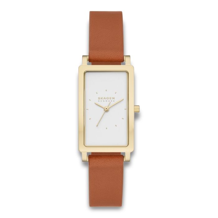 Skagen Hagen dameur i guldfarvet stål med hvid urskive og brun læderrem.