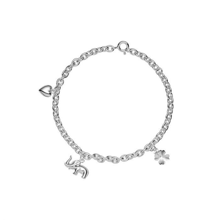 Lund Copenhagen børnearmbånd i sølv med hjerte, elefant og firkløver