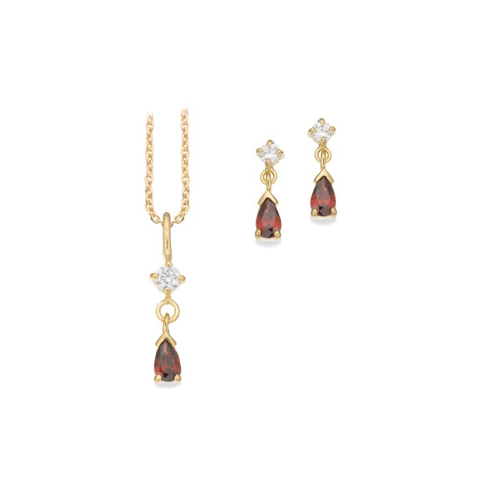 Scrouples smykkesæt i forgyldt med dråbe med rød zirkonia - halskæde og ørestikker
