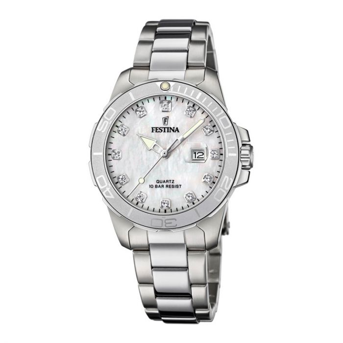 Festina dame armbåndsur i stål med perlemorsskive og zirkoner