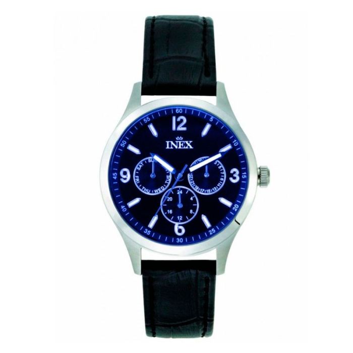 Inex herreur i stål, dato med sort rem og blå urskive, Ø38