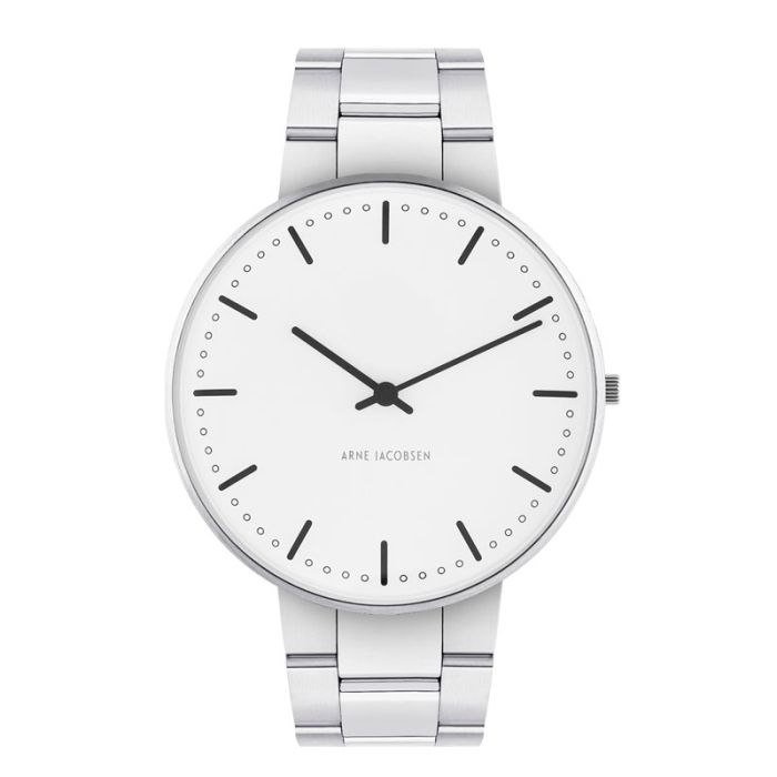 Arne Jacobsen City Hall ur i stål med hvid skive og stål lænke - Ø40