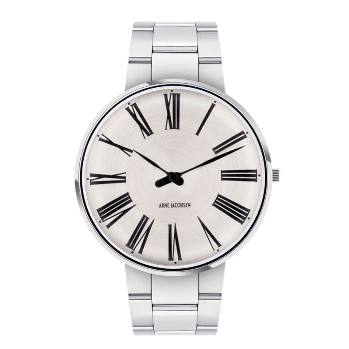 Arne Jacobsen Roman ur i stål med Sunray Silver skive og stål lænke - Ø40